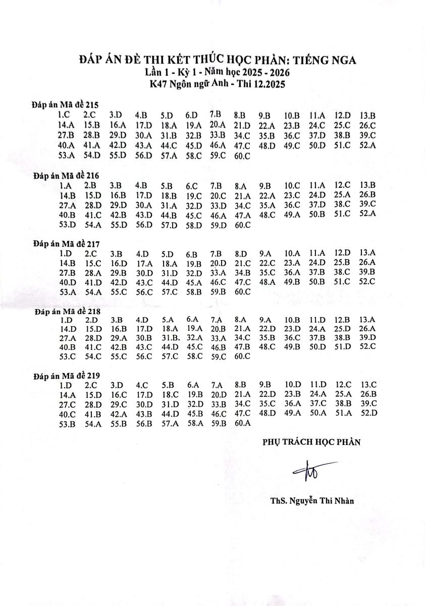 Đáp án Đề thi kết thúc học phần: Nga văn lần 1 - Kỳ 1 - Năm học: 2025-2026