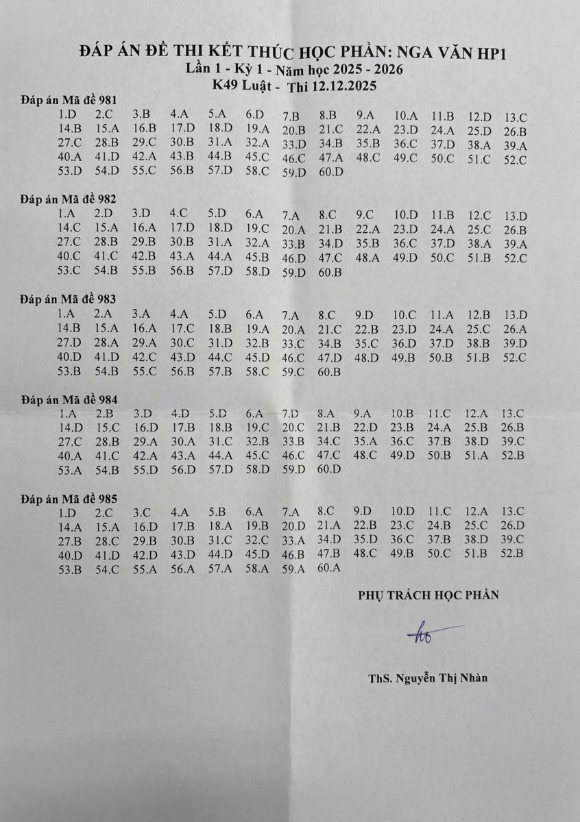 » BM. Nga - Pháp - Trung: Đáp án Kỳ thi hết học phần, HK1 năm học 2024-2025