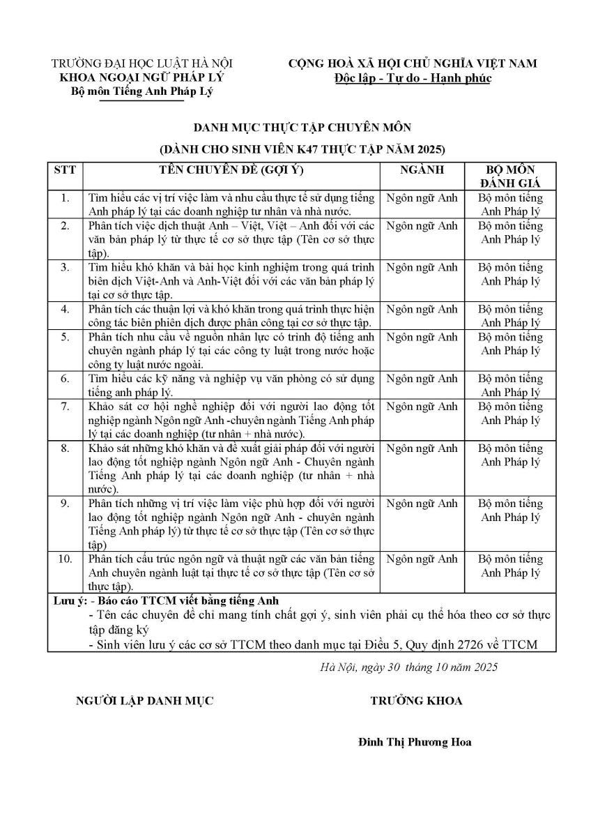 DANH MỤC THỰC TẬP CHUYÊN MÔN (DÀNH CHO SINH VIÊN K47 THỰC TẬP NĂM 2025)